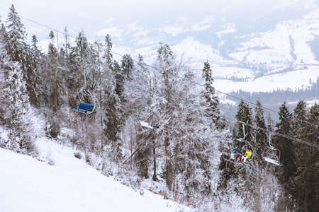 BUKOVEL, UKRAINE - December 17, 2016 : Skiers on a cable car in Bukovel. Bukovel is the most popular ski resort in Ukraine. Ski season and Winter sports concept