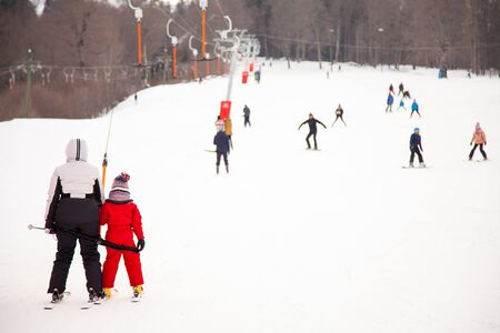 BUKOVEL, UKRAINE - December 9, 2018 - people skiing and snowboarding down by hill. winter activity. travel concept