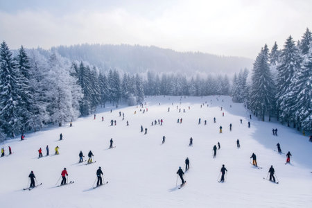Many skiers take advantage of a sunny winter day on a popular ski slope filled with fresh snow.