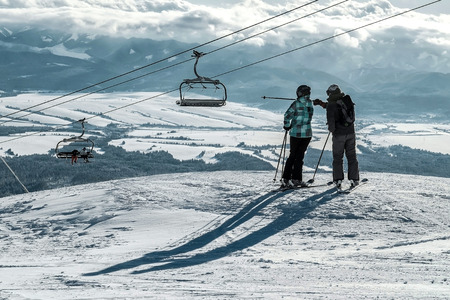 VALCA, SLOVAKIA - JANUARY 22, 2022: Skierssitting on ski-lift chair or chairlift at resort Snowland Valca in winter season.