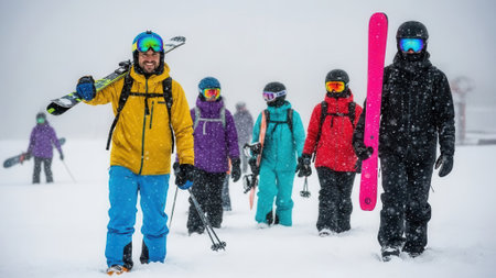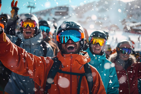 Joyful Group of Friends Enjoying Snowy Mountain Adventure in Winter Wonderland
