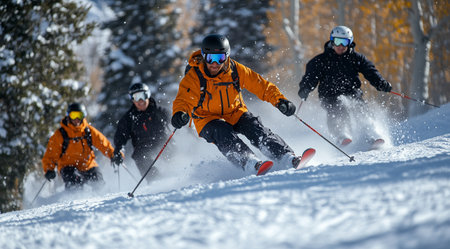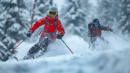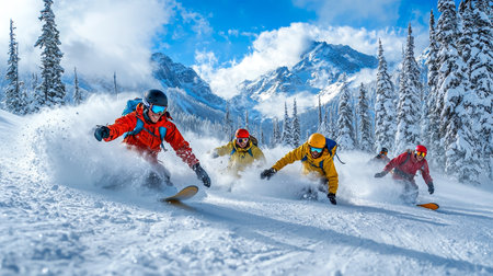 Group of skiers descends snowy mountain slope, surrounded by mist of powdery snow and tall evergreen trees under dramatic sky. scene captures thrill and beauty of winter sports.