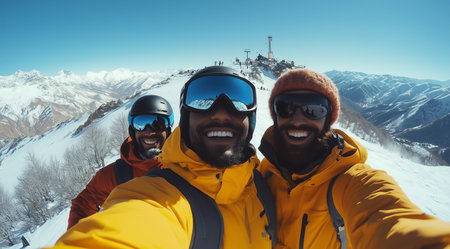 Skiing and snowboarding, a selfie of three men in suits, created on the basis of Generative AI technology.