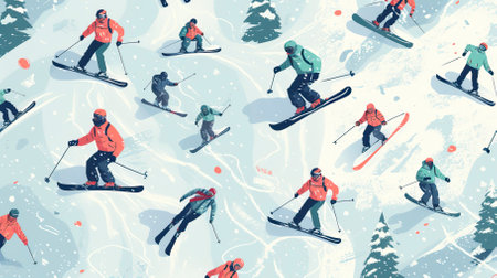 Snowboarders and skiers ride in the ski resort pattern