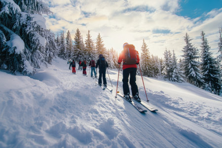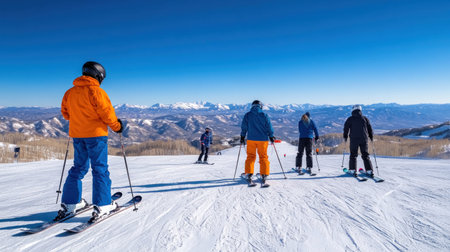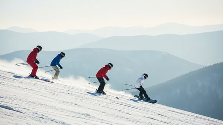 Group of young happy people Skiing On Snow Mountains. Travel, healthy life style, sport concept illustration made with AI generative