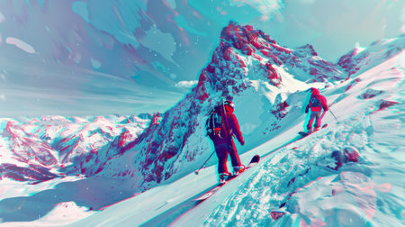 Men ski high up on frozen mountain peak generated by artificial intelligence