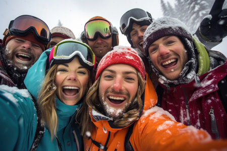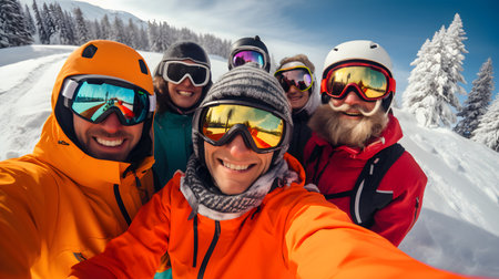 Group of friends at ski resort having fun on a snowy day, a group of people wearing ski equipment takes a selfie together, AI Generated