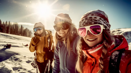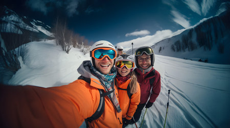 Selfie of people wearing ski equipment season. Winter fun snow extreme. Generate Ai