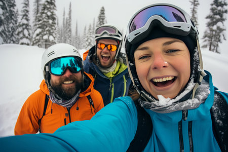 Picturesque Skiing friends selfie. Snow group. Generate Ai