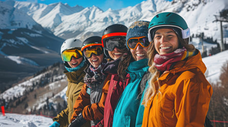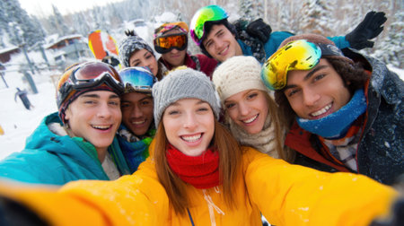 A group of young people bundled in colorful winter clothing poses for a cheerful selfie in a snowy ski resort. Snow covered trees and slopes create a festive atmosphere.