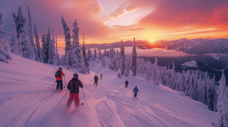 Skiers Descend a Snowy Mountain at Sunset Near a Picturesque Landscape Covered in Frost and Pine Trees During Winter. Generative AI