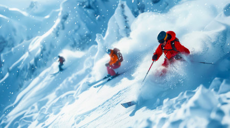 Skiers dressed in colorful gear carve through the deep powder, leaving trails on the pristine white snow on a bright winter day.