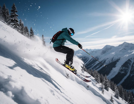 Skiing and snowboarding, a person in the process of skiing, is created on the basis of Generative AI technology.