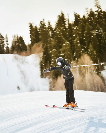 Young sporty person skiing ski resort track snowy mountain healthy lifestyle winter sport athletics olympic vacation hill downhill nature adrenalin rush snowboard cold slope sunny weather fresh air