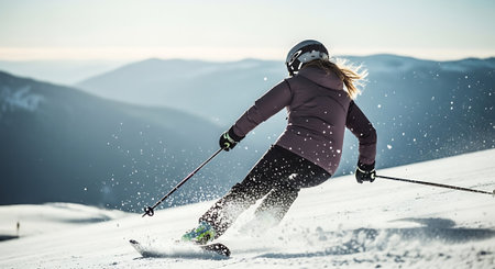 Woman skis downhill through fresh powder as sunlight glints off airborne snow with distant mountain peaks in the background capturing motion, speed and outdoor winter adventure in natural light