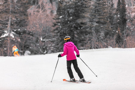 Skier woman skiing learning to ski on mountain slope. Winter sport outdoor activity. Girl from behind in pink jacket and goggles, helmet, skis, poles.