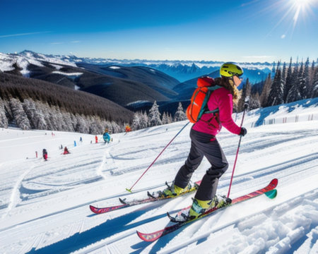Generative AI Image of Beautiful Female Skier Wear Helmet on Snowy Mountain Hill at Winter Season