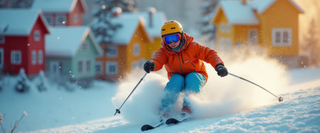 A skilled skier, clad in a vibrant orange jacket and blue pants, expertly navigates a snowy slope, sending up a spray of powder. The colorful houses in the background create a picturesque winter scene, evoking a sense of adventure and joy in the snowy landscape.