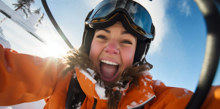 Skiers Capturing A Funfilled Moment With Friends In A Selfie. Concept Hiking Adventures, Natural Landscapes, Golden Hour Portraits, Family Gatherings, Urban Street Photography.