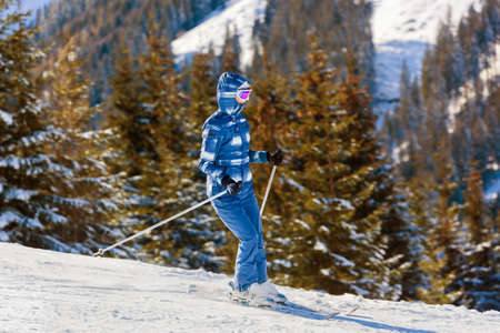 Young woman skier skiing downhill at beautiful sunny winter day in mountains
