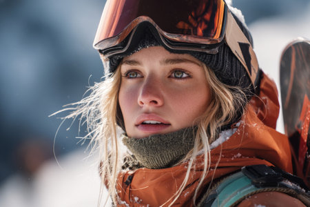 A young woman stands poised and focused, wearing winter gear and goggles, ready to embark on an exciting snowboarding adventure in a snowy mountain landscape under clear blue skies.