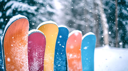 Lively display of colorful skis in a winter landscape at a ski resort. Flurries of snow create a magical atmosphere, inviting winter sports enthusiasts to enjoy the snowy slopes.