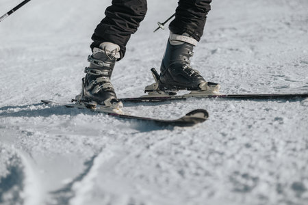 Close-up of skiers boots and skis on snowy terrain in winter