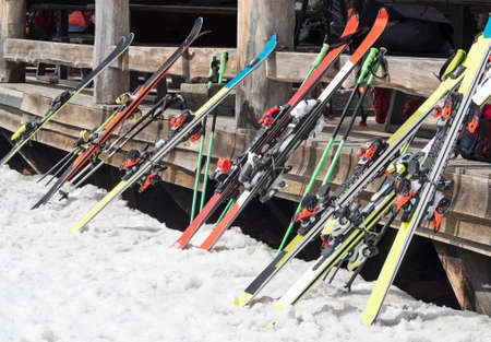 Photo of multi-colored skis in snow at winter resort
