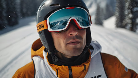 Selfie of people wearing ski equipment season. Winter fun snow extreme. Generate Ai