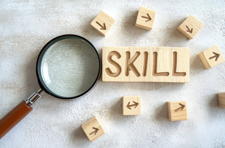 Magnifying glass over the word SKILL with arrows pointing up, wooden blocks on a light background, in the style of a stock photo. --ar 23:15 --v 6.1 Job ID: 1dc65904-c38b-457b-bce1-2c8aedb6c30e