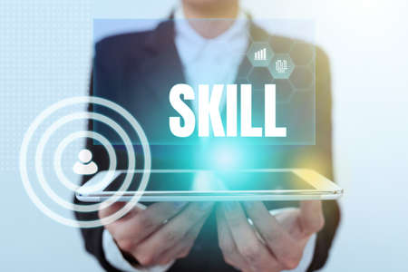 Writing displaying text Skill. Conceptual photo ability to use one s is knowledge effectively and readily in execution Lady In Uniform Holding Touchpad Showing Futuristic Virtual Interface.