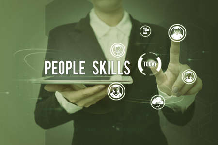 Text caption presenting People Skills. Word Written on Get Along well Effective Communication Rapport Approachable Lady holding tablet symbolizing successful teamwork accomplishments.