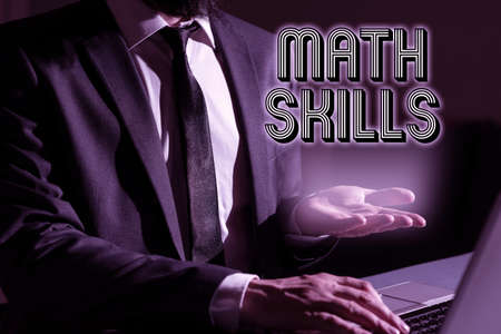 Writing displaying text Math Skills. Business concept starting to learn how to count numbers add divide use equation Man Typing Important Data Into Laptop And Presenting New Idea Over Hand.