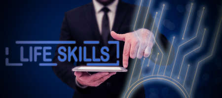Hand writing sign Life Skills. Word Written on that is necessary or desirable full participation in everyday Businessman in suit holding open palm symbolizing successful teamwork.