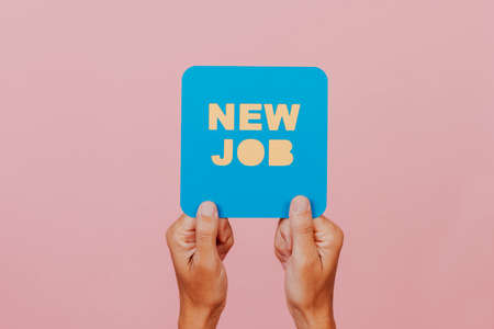 a man holds a blue paper signboard in the shape of a speech bubble with the text new job in it, on a pink background