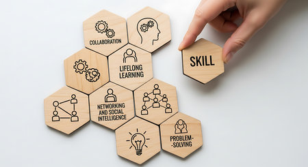 Hand placing hexagonal wooden tile with S K I L text onto cluster of skill concept tiles learning business