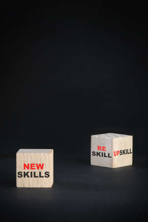 New skills, reskill and upskill written on wooden cubes on black background. Empower yourself concept and beginning to success idea