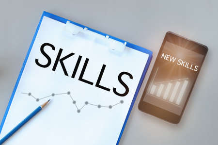 Skills and graph written on paper with pencil and new skills with growth graph on smartphone on grey background. Reskilling and upskilling concept with technology self improvement for success idea