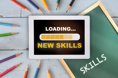 Skills word written on chalkboard and new skills loading on computer digital tablet with coloured pencil on wooden desk. Reskilling and upskilling concept and technology transformation learning