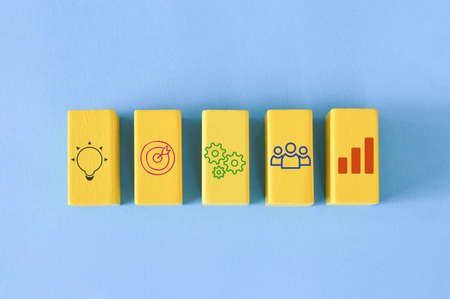 Wooden block with graph, people, cogwheel, goal and light bulb symbols. Business financial and strategy concept