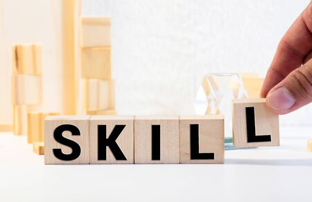 Skills. Motivational internet business words quotes, wooden lettering typography concept