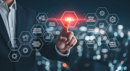 A businessman's finger points to a glowing hexagonal icon labeled SKILL on a digital interface. Surrounding it are other hexagonal icons representing various skills and intelligence types, set against a blurred city skyline at night.
