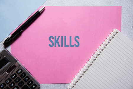 Skills text on pink and blue background flat lay concept. Suitable to used as title cover each subtopic on resume or curriculum vitae.
