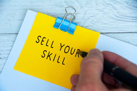 Hand writing sell your skill text on yellow notepad. Skill concept
