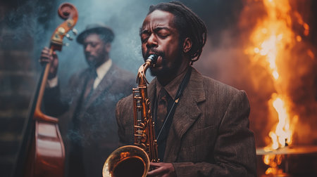 A saxophonist gives a soulful performance, accompanied by a bassist, against a dramatic fiery background. The image evokes passion, artistry, and the ambiance of a live jazz performance.