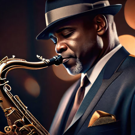 A man in a hat and blazer plays a saxophone against an orange and brown backdrop. The image displays a side profile of the musician, emphasizing the instrument and performance. The style appears artistic with a diffused effect. Suitable for editorial and commercial applications.