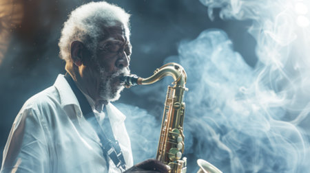 Blurred image of an elderly jazz musician with a gray beard passionately plays the saxophone, surrounded by swirling smoke. AI generation