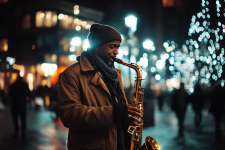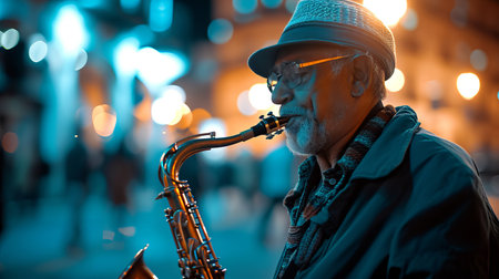 A musician passionately plays the saxophone in a bustling urban environment, creating a warm ambiance with blurred bokeh lights in the background. The scene emphasizes art, culture, and musical expression.
