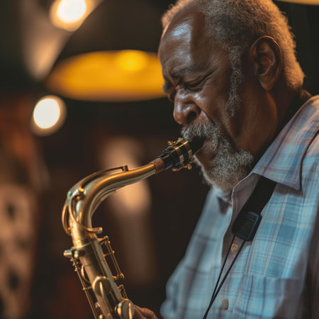 Elderly Man Playing Saxophone in Cozy Jazz Club Capturing Musical Passion and Nostalgia.