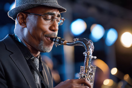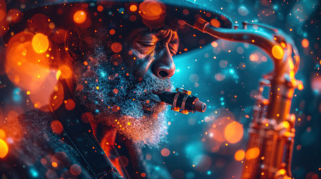 An expressive jazz musician plays the saxophone passionately, illuminated by a colorful background with warm bokeh lights, creating a cozy and artistic ambiance.